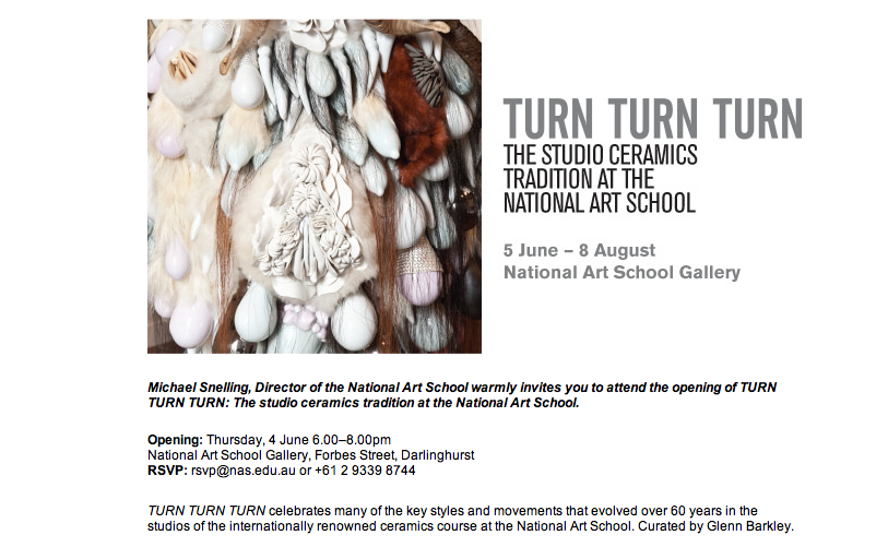 Uncategorized In the Riverbowl – and ‘Turn, Turn, Turn’ 2015 Posted on May 28, 2015 by Louise Boscacci: The Blue Chamber Reading time less than 1 minute River bowl 5 ☛ roll ☛ circumambulate in: TURN TURN TURN: The studio ceramics tradition at the National Art School. Opening: Thursday, 4 June 6.00–8.00pm National Art School Gallery, Forbes Street, Darlinghurst, SYDNEY AU +61 2 9339 8744 5 June 5 – 8 August, 2015 ☛ read Flow and Chance read: ArtLINK REVIEW Related