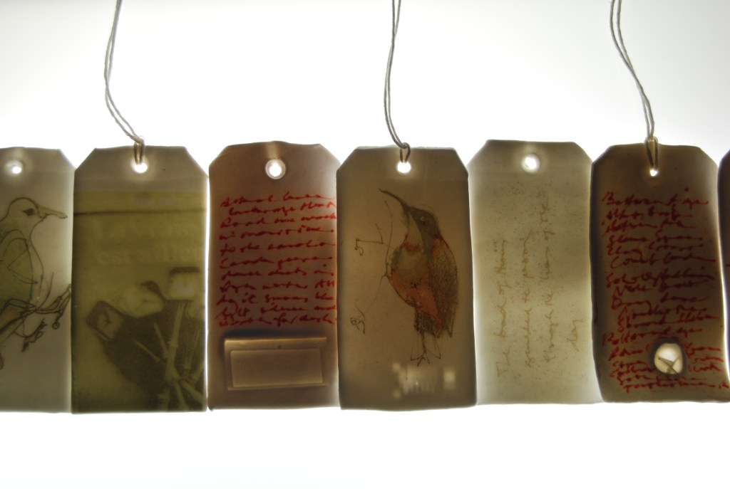 Bird tag, 2009–2022. Translucent porcelain, cotton, open-field sound recordings.
